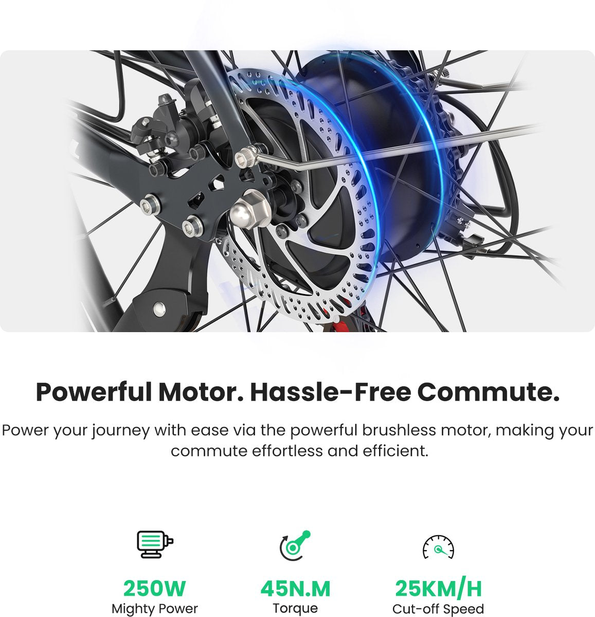 De Touroll J1 ST heeft een krachtige borstelloze motor die 45N.M koppel levert en een cut-off snelheid van 25 km/u. De robuuste motor heeft weinig onderhoud nodig en levert consistent vermogen op vlak terrein, perfect voor woon-werkverkeer in de stad en recreatieve uitstapjes.