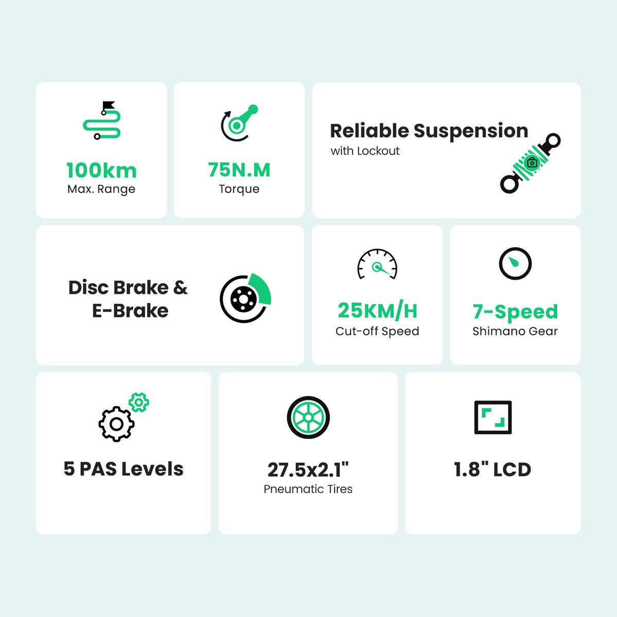 De J1 ST elektrische fiets heeft 27,5-inch premium luchtbanden, die zorgen voor verbeterde tractie en stabiliteit op alle terreinen voor moeiteloos en stabiel bergopwaarts klimmen en een soepele rit op oneffen wegdek. Hij wordt geleverd met een professionele Shimano derailleur met 7 versnellingen waarmee je met gemak kunt schakelen en op weg kunt.