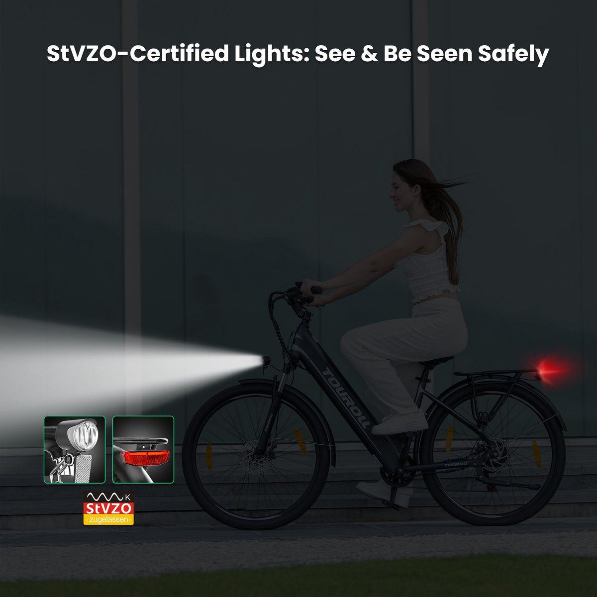 Dankzij de StVZO-gecertificeerde fietsverlichting op de trekkingfiets J1 ST vergroot de lichtbundel de zichtbaarheid op de weg aanzienlijk zonder andere weggebruikers te verblinden, wat resulteert in veiliger rijden op de weg. De stevige bagagedrager kan de last van het reizen effectief verlichten, waardoor hij ideaal is voor winkelen, woon-werkverkeer en een lange tour.