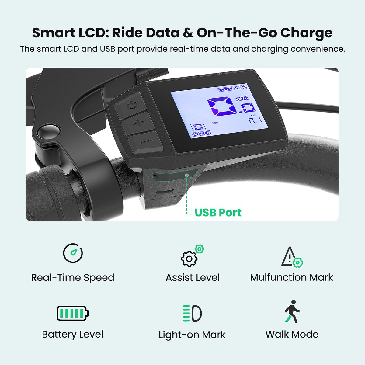 De J1 ST wordt geleverd met een slim LCD-scherm met een USB-poort, waarmee je niet alleen op de hoogte blijft van belangrijke gegevens, zoals real-time snelheid, maar waarmee je ook je digitale apparaten kunt opladen wanneer dat nodig is. Met het display kun je ook eenvoudig schakelen tussen 5 trap ondersteuningsstanden, waaronder 12, 15, 18, 21 en 25 km/u, en de 6 km/u loopstand activeren.